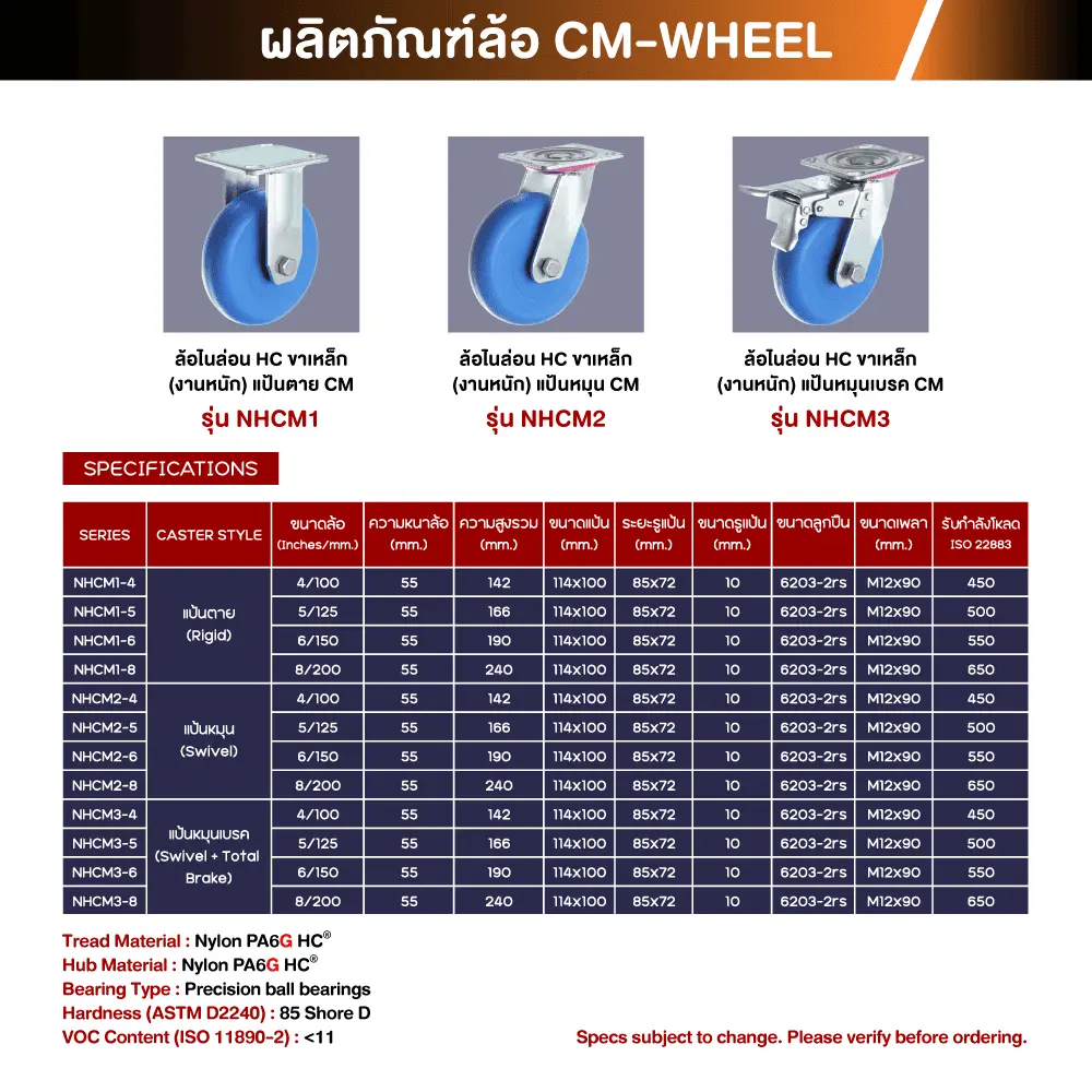 ล้อMCไนล่อนHC®งานหนัก – CM ของเราสามารถรองรับน้ำหนักการใช้งาน ตามการโหลดใช้ที่ระบุตามขนาดมาตรฐานสินค้าได้ตรงจริง มีมาตรฐานรองรับสูง ทำให้ผู้ใช้งานจริงหมดกังวลกับปัญหาที่พบกับสินค้าทั่วไปในท้องตลาด