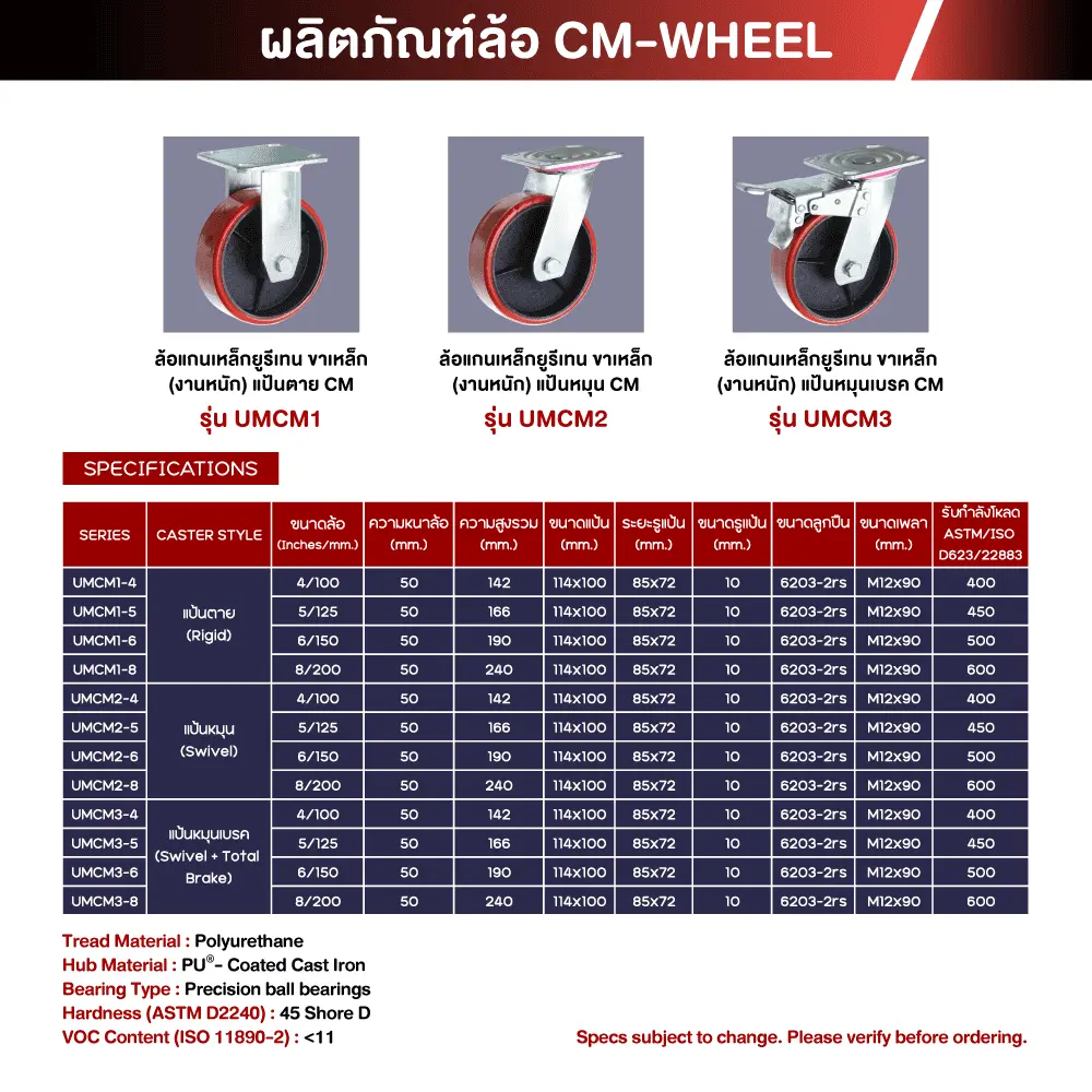 ล้อยูรีเทนแกนเหล็ก งานหนัก – CM ของเราสามารถรองรับน้ำหนักการใช้งาน ตามการโหลดใช้ที่ระบุตามขนาดมาตรฐานสินค้าได้ตรงจริง มีมาตรฐานรองรับสูง ทำให้ผู้ใช้งานจริงหมดกังวลกับปัญหาที่พบกับสินค้าทั่วไปในท้องตลาด