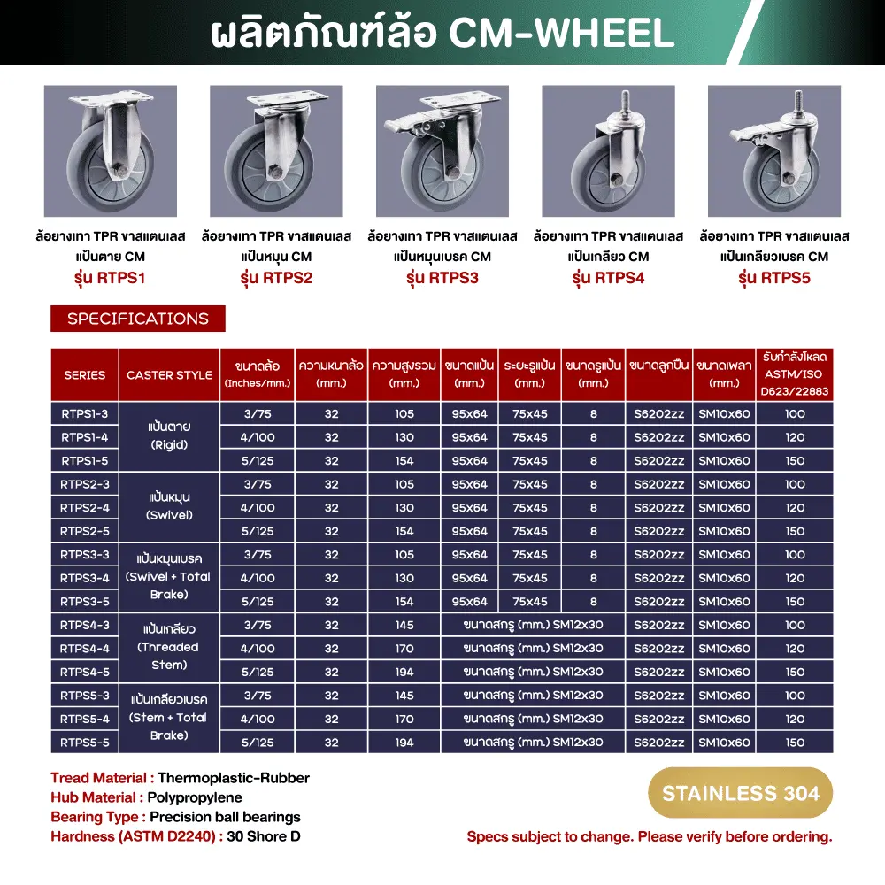 ล้อสแตนเลสยางเทา คุณภาพสูง – CM ของเราสามารถรองรับน้ำหนักการใช้งานตามการโหลดใช้ที่ระบุตามขนาดมาตรฐานสินค้าได้ตรงจริง มีมาตรฐานรองรับสูง ทำให้ผู้ใช้จริงหมดกังวลกับปัญหาที่พบกับสินค้าทั่วไปในท้องตลาด