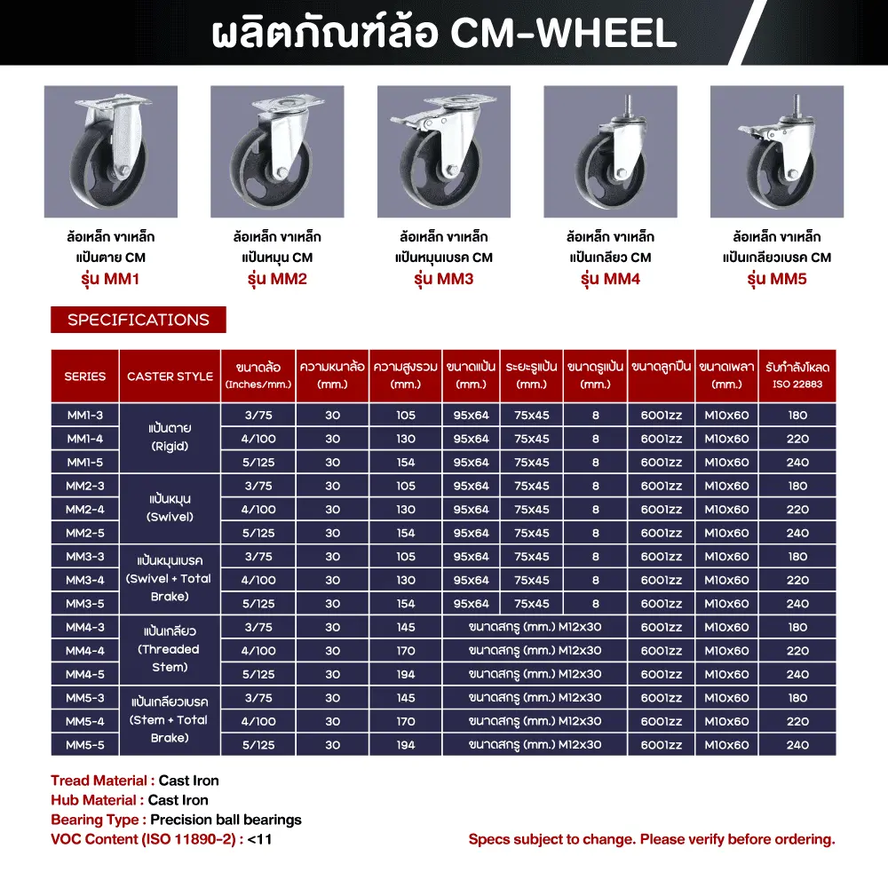 ล้อเหล็กคุณภาพสูง – CM ของเราสามารถรองรับน้ำหนักการใช้งาน ตามการโหลดใช้ที่ระบุตามขนาดมาตรฐานสินค้าได้ตรงจริง มีมาตรฐานรองรับสูง ทำให้ผู้ใช้งานจริงหมดกังวลกับปัญหาที่พบกับสินค้าทั่วไปในท้องตลาด