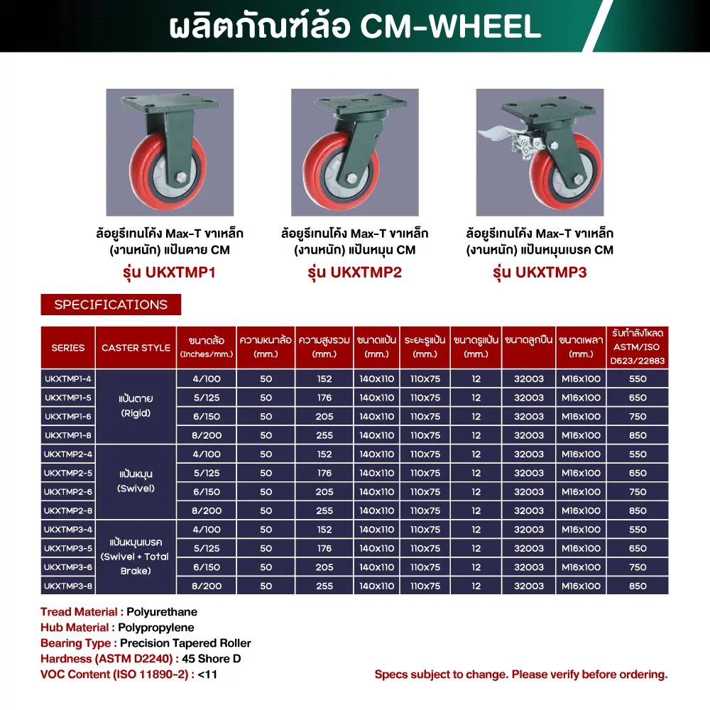 ล้อยูรีเทนโค้ง®Max-T งานหนัก – CM ของเราสามารถรองรับน้ำหนักการใช้งาน ตามการโหลดใช้ที่ระบุตามขนาดมาตรฐานสินค้าได้ตรงจริง มีมาตรฐานรองรับสูง ทำให้ผู้ใช้งานจริงหมดกังวลกับปัญหาที่พบกับสินค้าทั่วไปในท้องตลาด