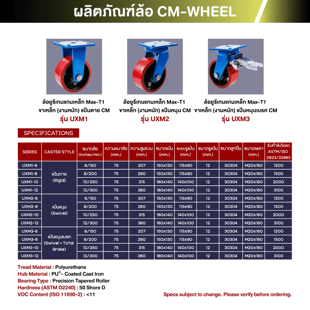 ล้อยูรีเทนแกนเหล็กMax-T1 งานหนัก – CM ของเราสามารถรองรับน้ำหนักการใช้งาน ตามการโหลดใช้ที่ระบุตามขนาดมาตรฐานสินค้าได้ตรงจริง มีมาตรฐานรองรับสูง ทำให้ผู้ใช้งานจริงหมดกังวลกับปัญหาที่พบกับสินค้าทั่วไปในท้องตลาด