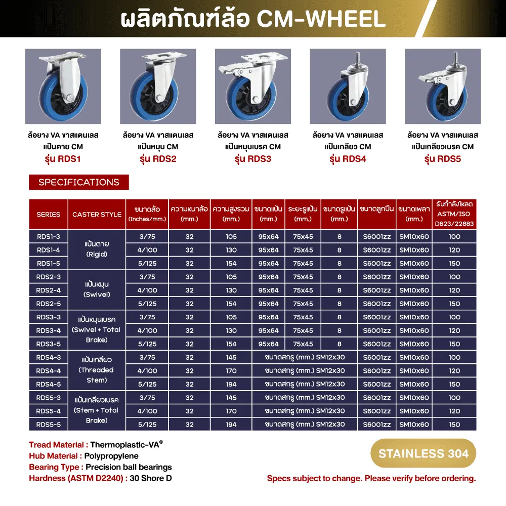 ล้อสแตนเลสยางอีลาสติก VA® คุณภาพสูง – CM ของเราสามารถรองรับน้ำหนักการใช้งาน ตามการโหลดใช้ที่ระบุตามขนาดมาตรฐานสินค้าได้ตรงจริง มีมาตรฐานรองรับสูง ทำให้ผู้ใช้งานจริงหมดกังวลกับปัญหาที่พบกับสินค้าทั่วไปในท้องตลาด